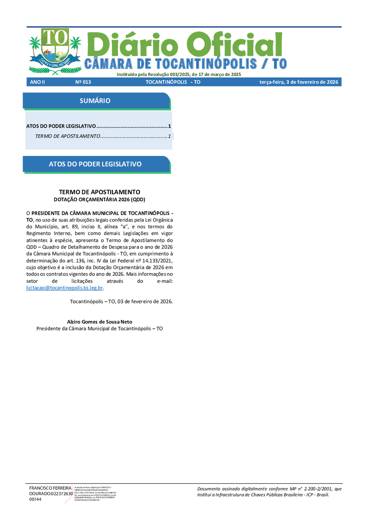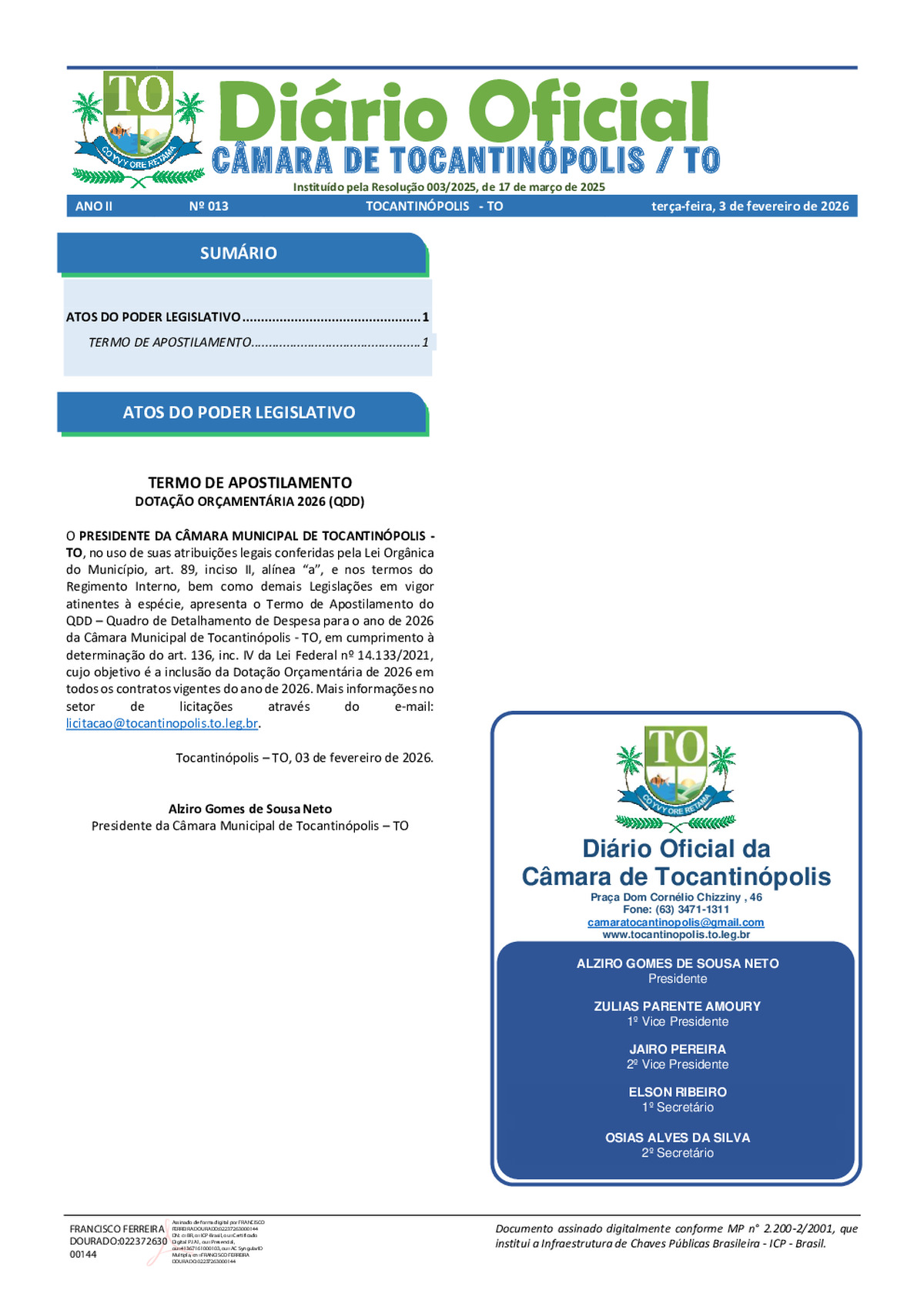 Lista de presença da 1ª Sessão Ordinária de fevereiro de 2026